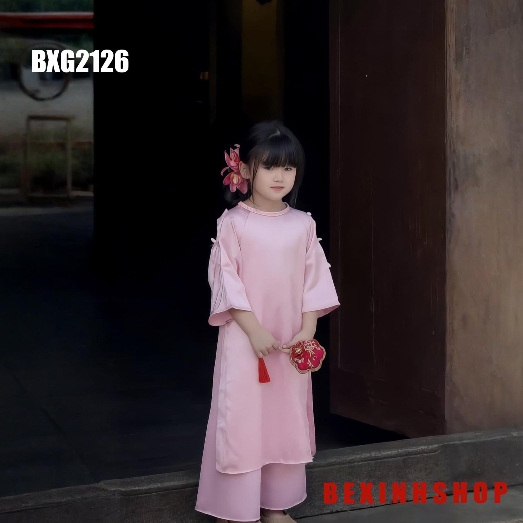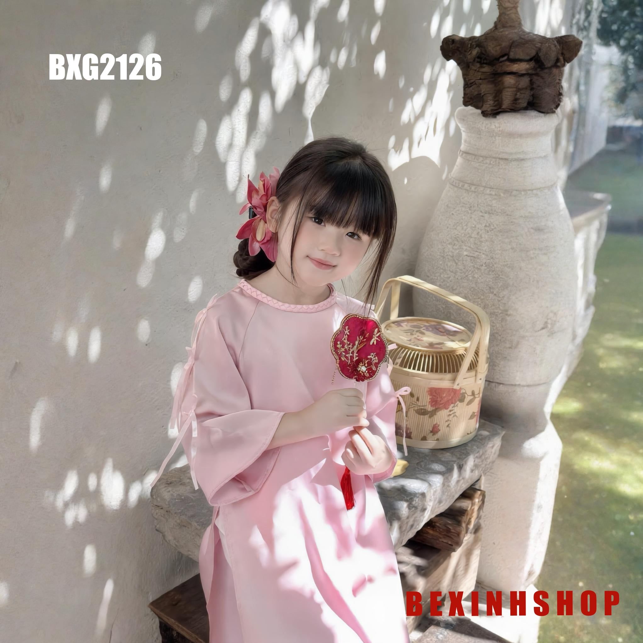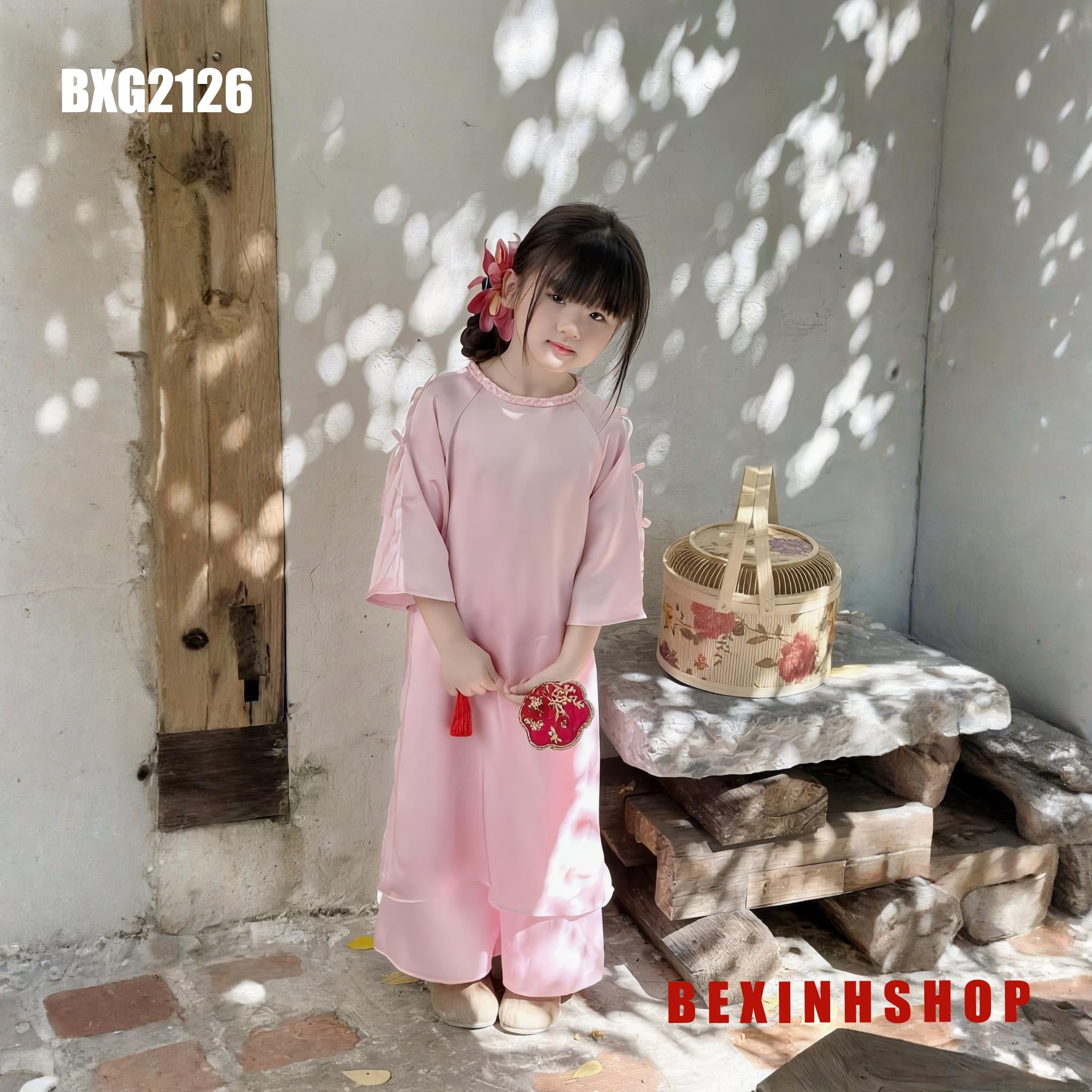 - Thiết kế: Set áo dài cách tân cổ thuyền, tay may nơ viền đáng yêu, kèm quần cùng tone, phom rộng như mẫu, thích hợp cho bé những ngày Xuân 2026.