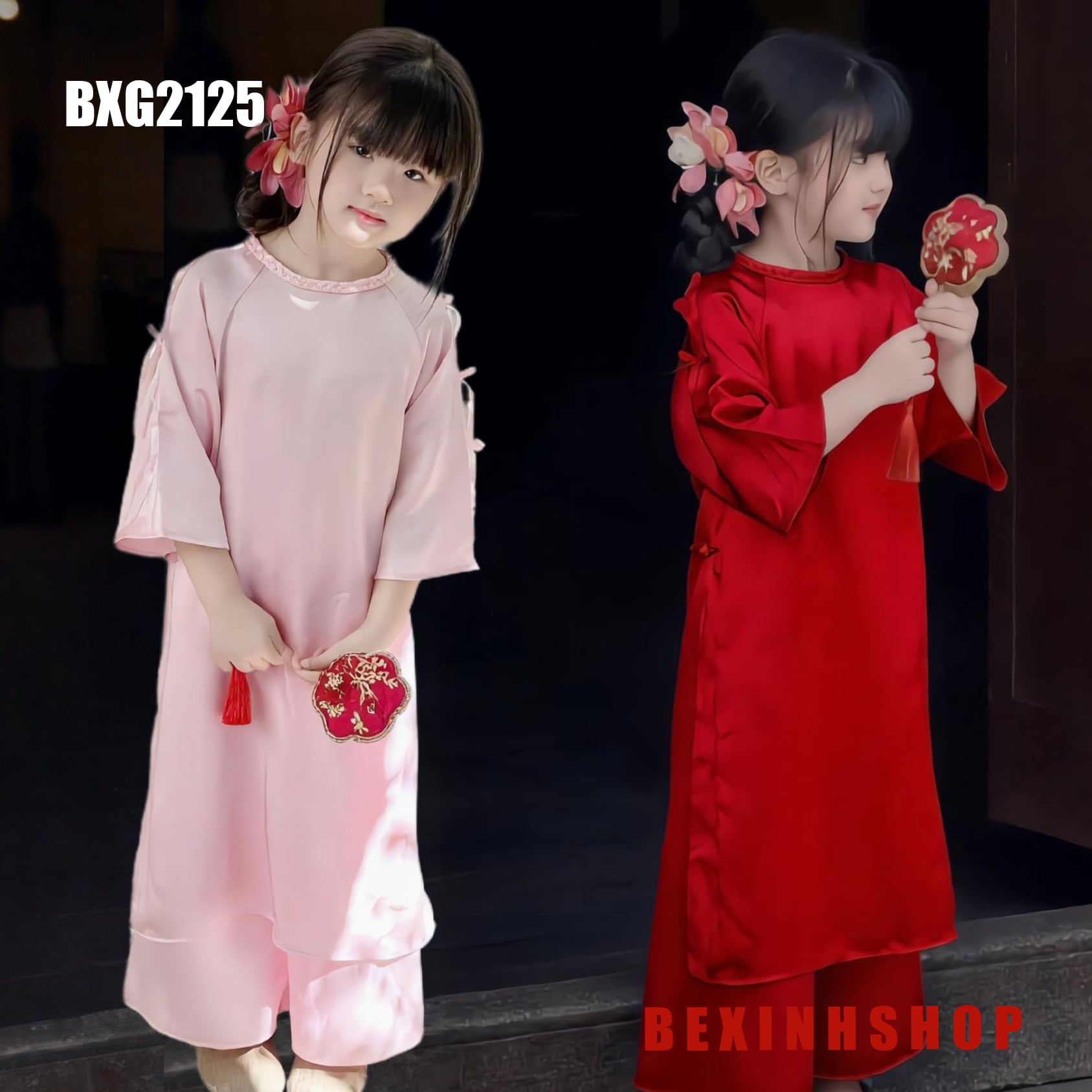Set áo dài cách tân đính nơ tay cho bé gái mặc Lễ Tết BXG2125