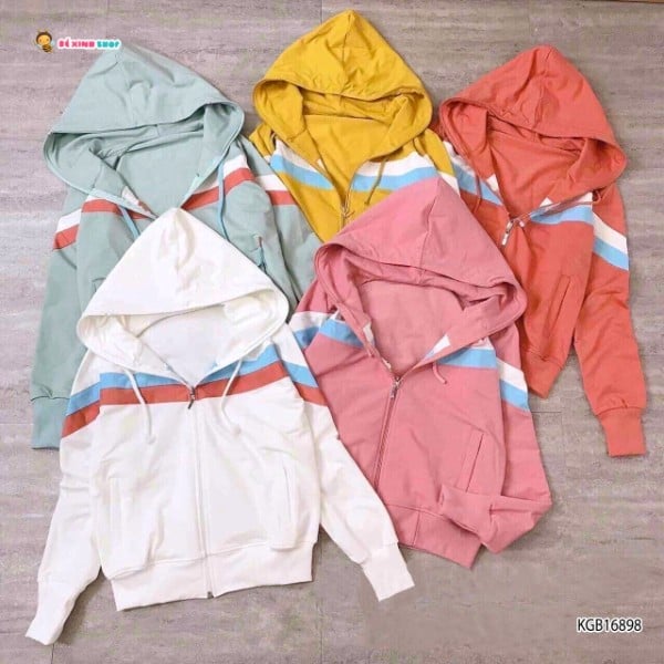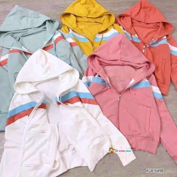 | Thiết kế | Áo khoát phối sọc dễ thương cho bé gái đi nắng. Kiểu dáng áo khoát dây kéo phối sọc túi mổ ,chất liệu da cá loại đẹp, mềm mịn, thấm hút mồ hôi tốt. Có 3 màu: Trắng - Hồng - Vàng. Nhí SIZE 1-8. Đại Size 9-14 | |