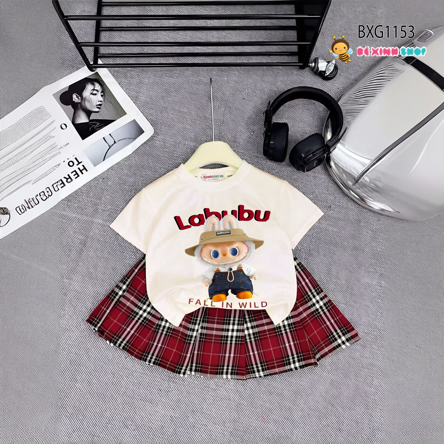 Bộ áo labubu chân váy caro kèm chip dễ thương cho bé gái BXG1153
