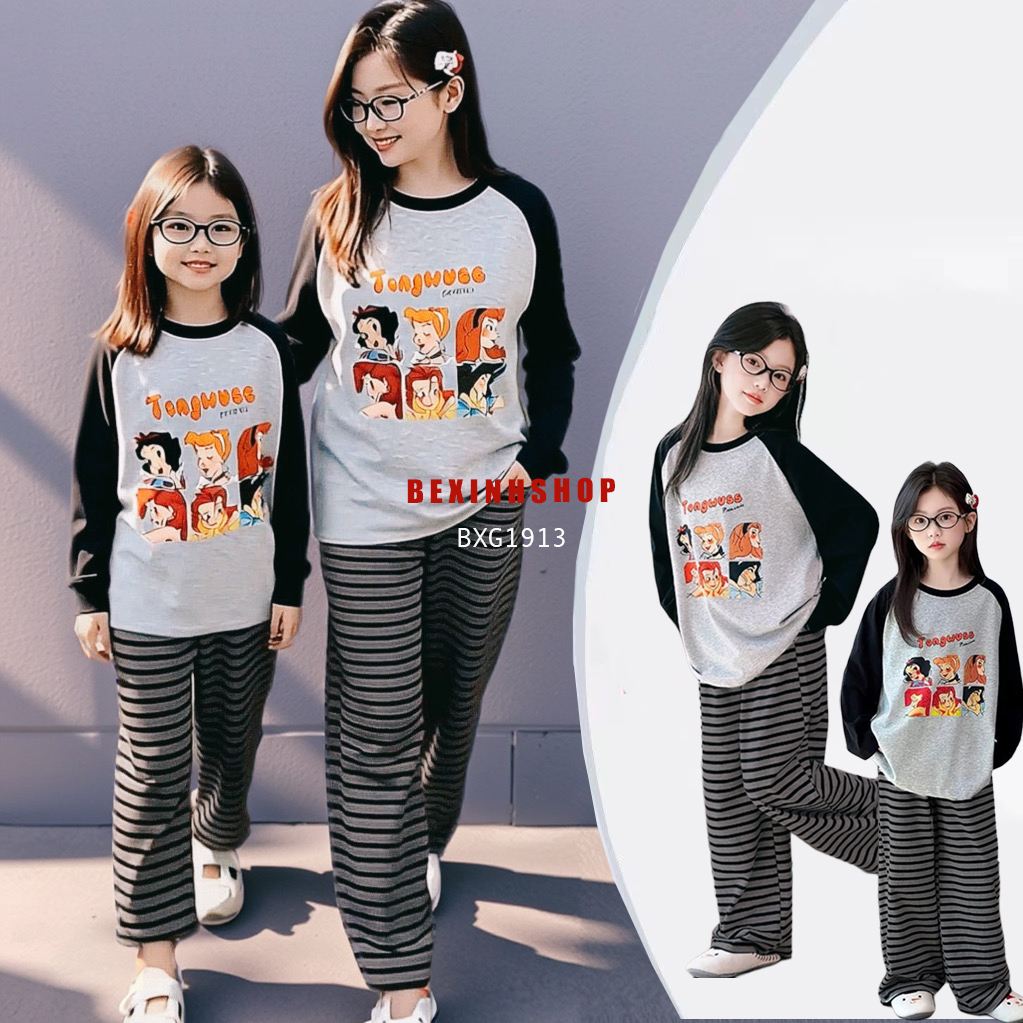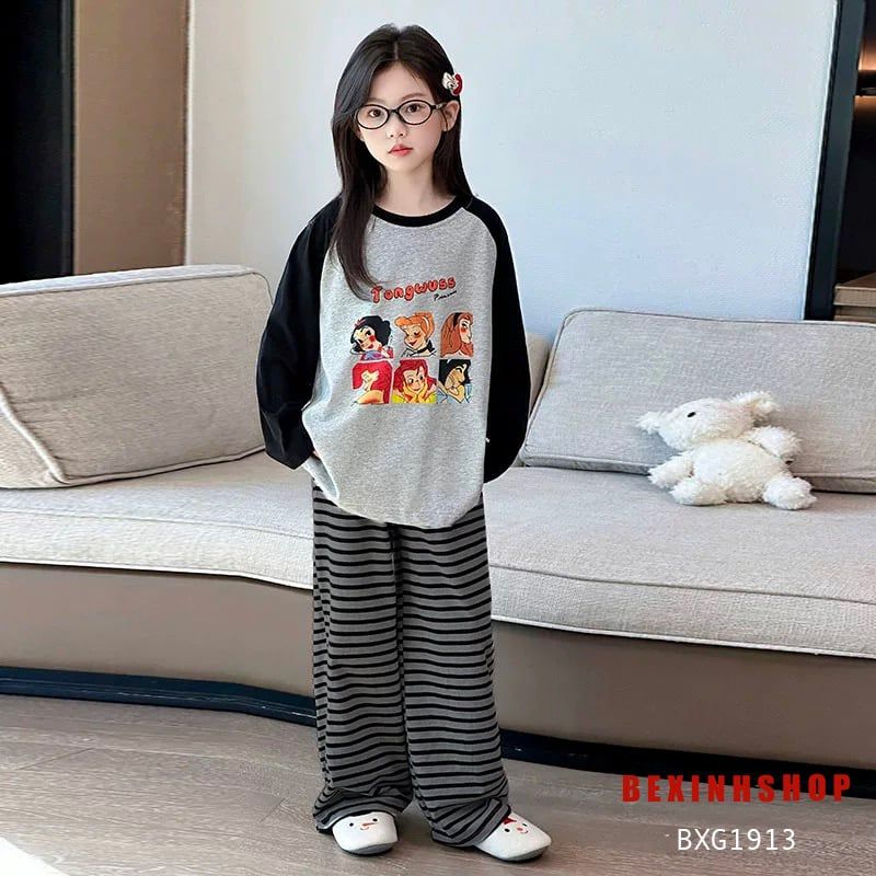 Bộ dài tay in hình CÔNG CHÚA quần sọc ống suông dễ thương cho bé gái BXG1913