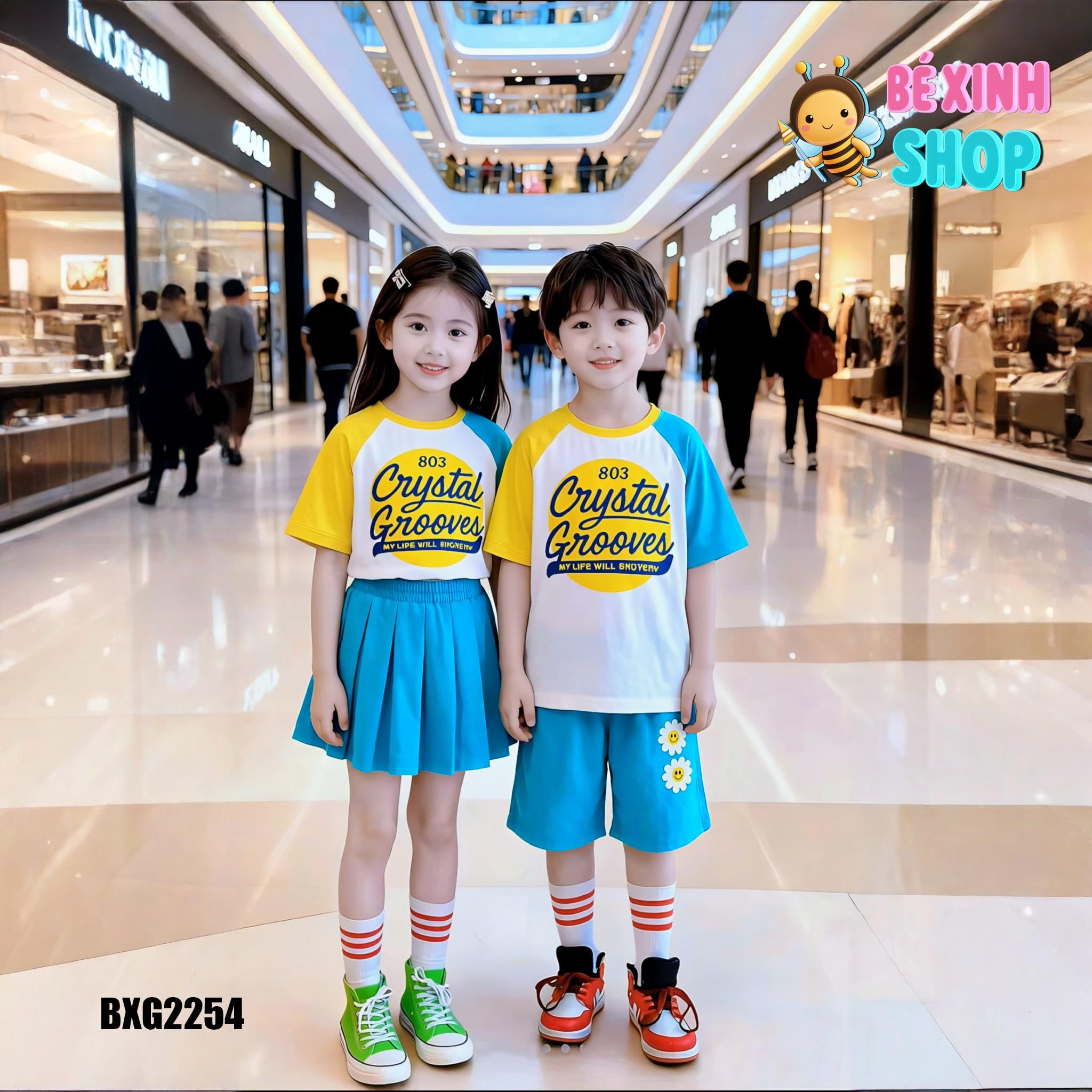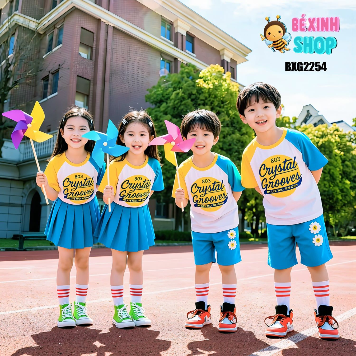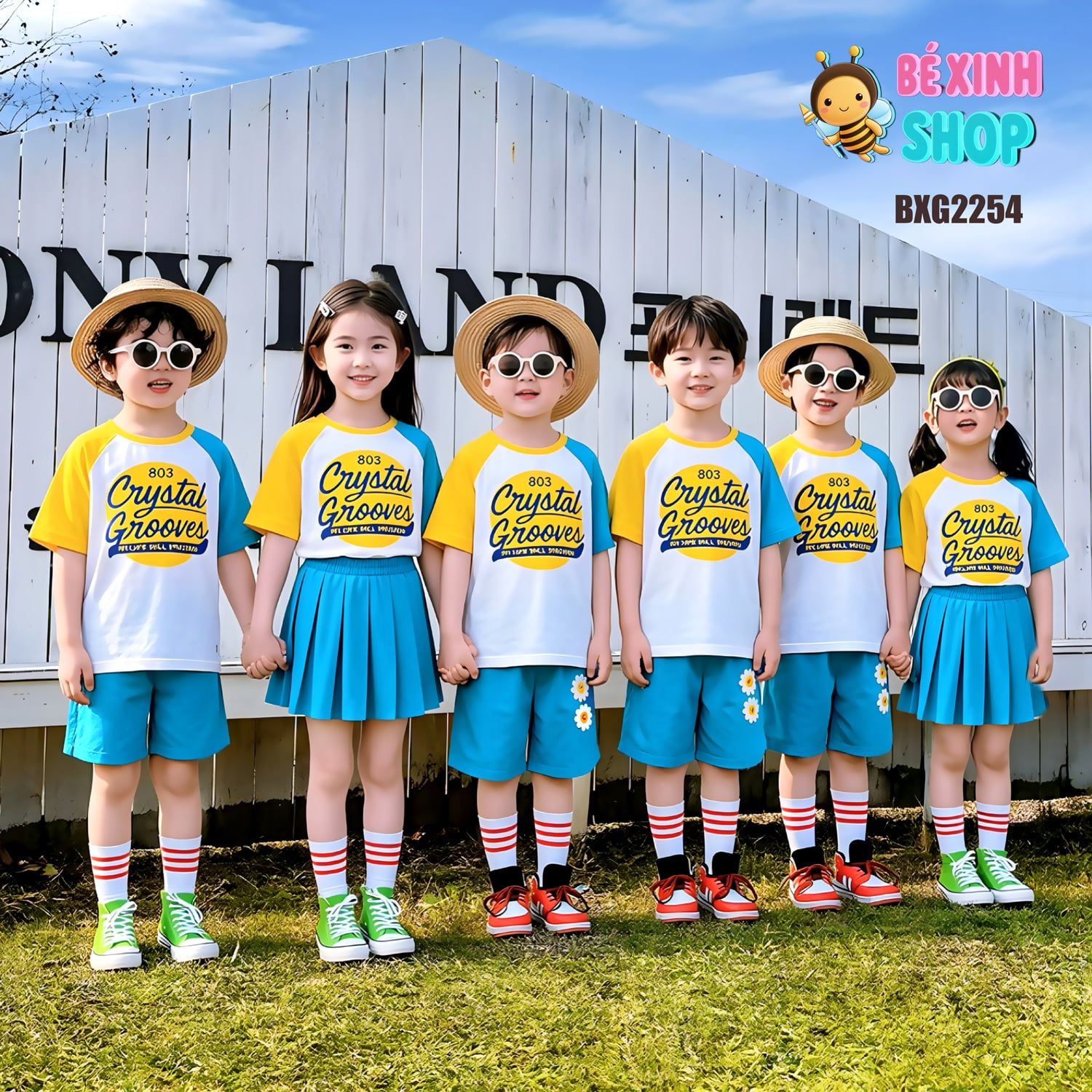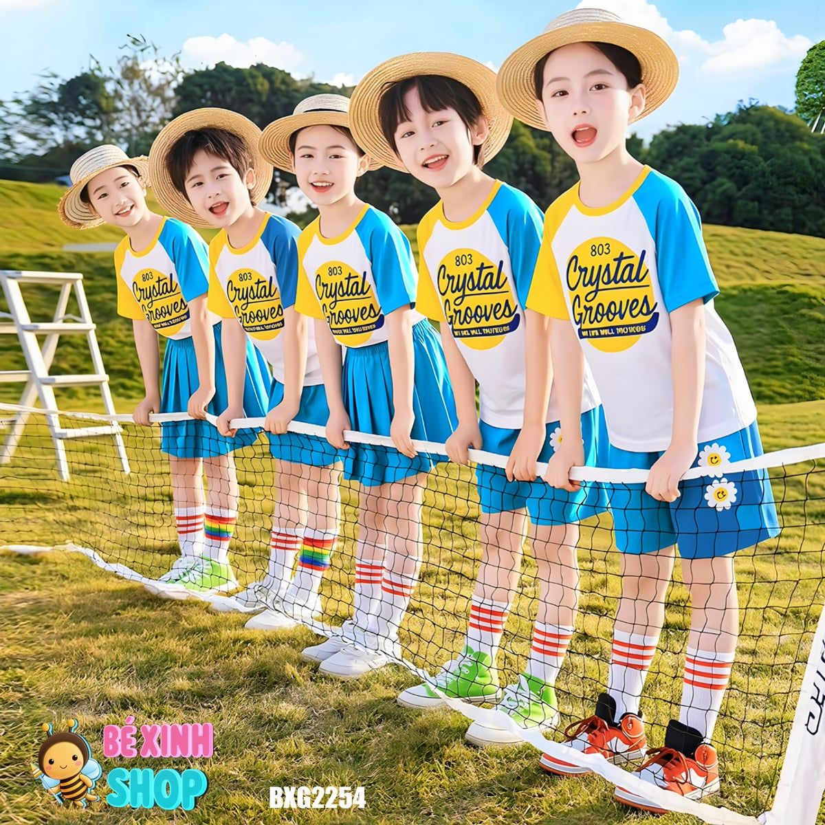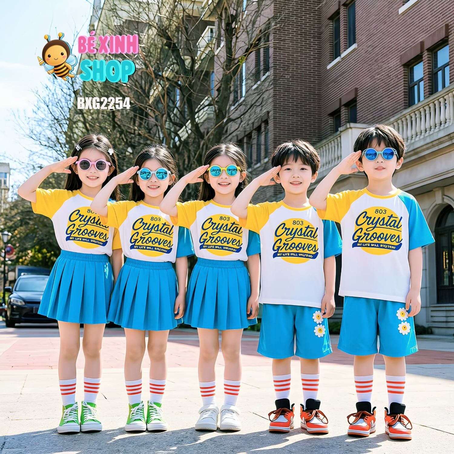 Bộ đồng phục bé trai & bé gái áo thun In Chữ Crystal quần váy cho bé nhảy múa, đi chơi BXG2254