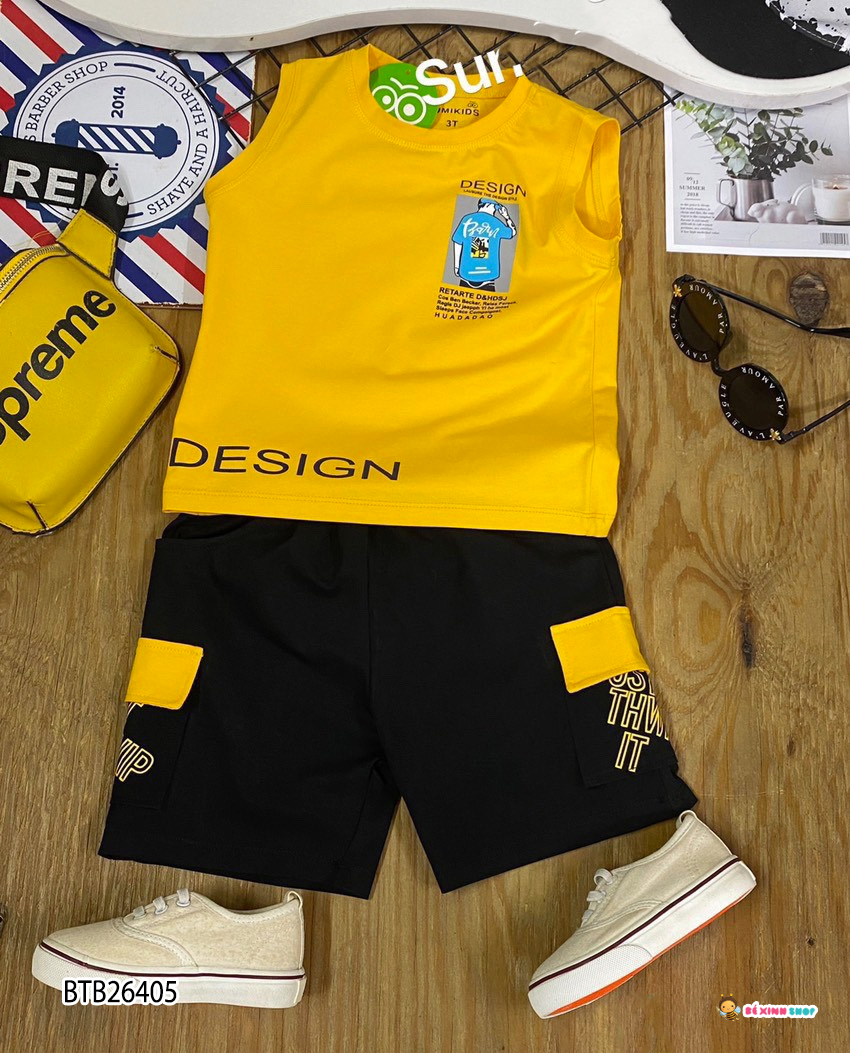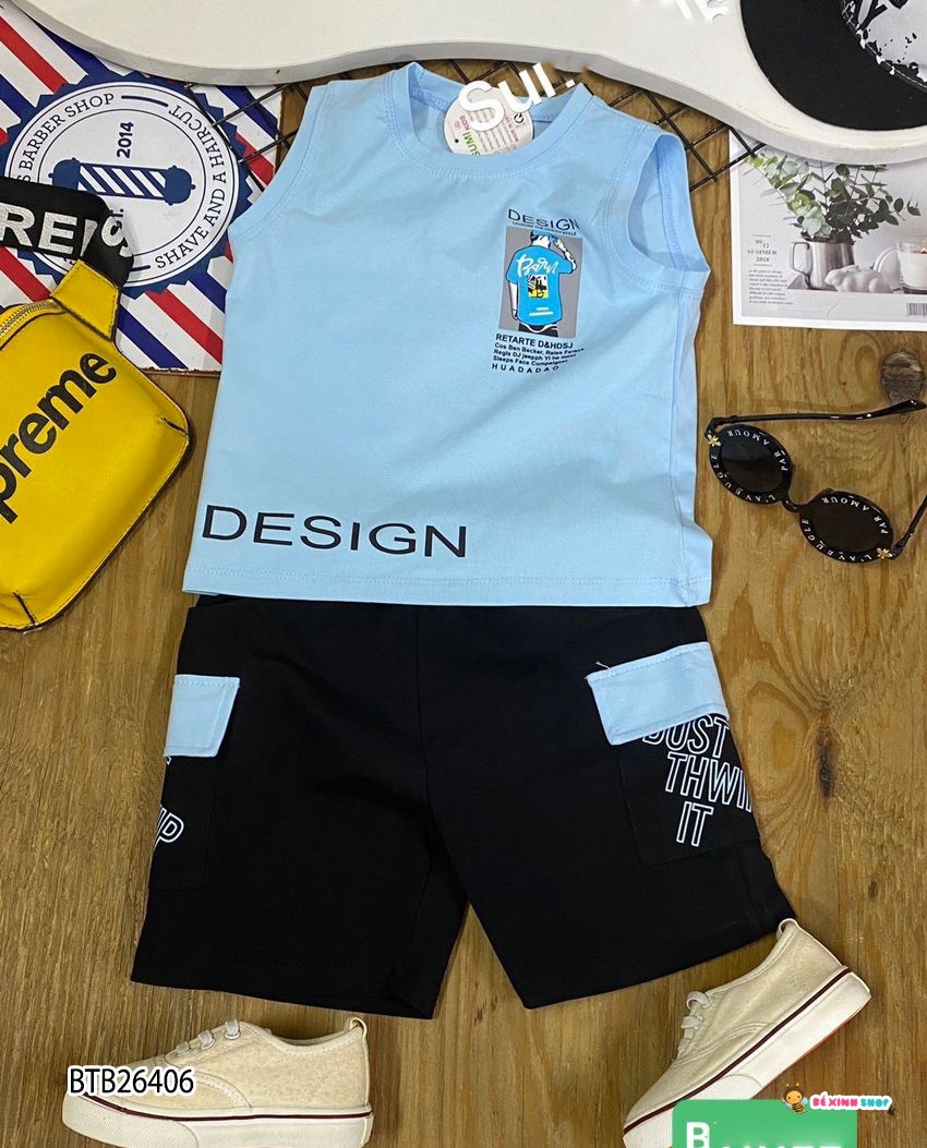 Bộ sát nách in chữ DESIGN dễ thương cho bé trai . Nguyên bộ may bằng chất thun cotton 4c mềm mịn, áo form sát nách mát mẻ, hình in charm sắc nét. Quần form qua gối rộng rãi thoải mái, 2 bên đắp túi và nắp, túi in chữ. Form rộng rãi thoải mái. Nhí size 2-9. Đại Size 10-15. Cồ size 16-20.