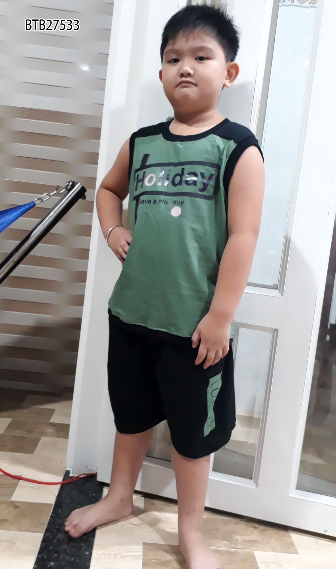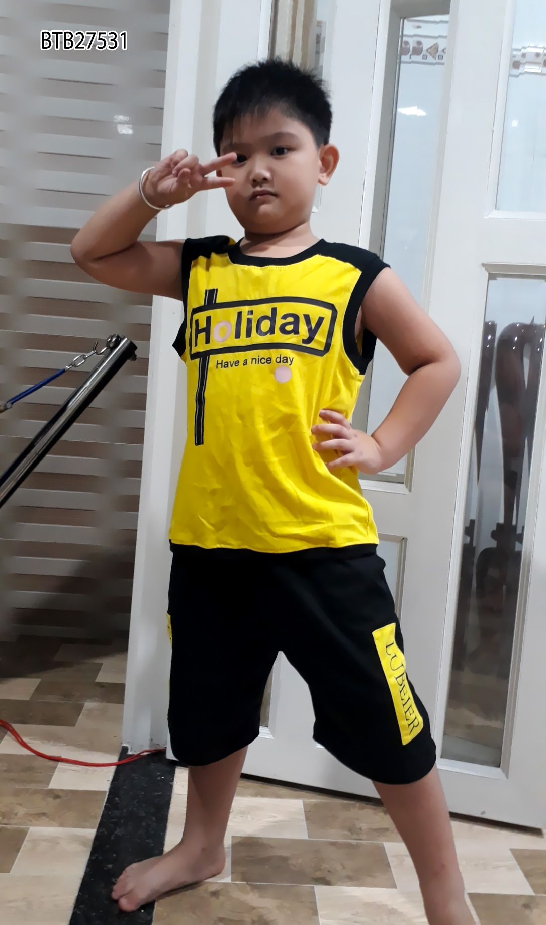 Bộ thun sát nách in chữ HOLIDAY dễ thương cho bé trai mùa hè. Chất thun cotton mềm mát, thấm hút mồ hôi tốt, hình in sắc nét, cá tính. Nhí size 3-10. Đại size 11-17.