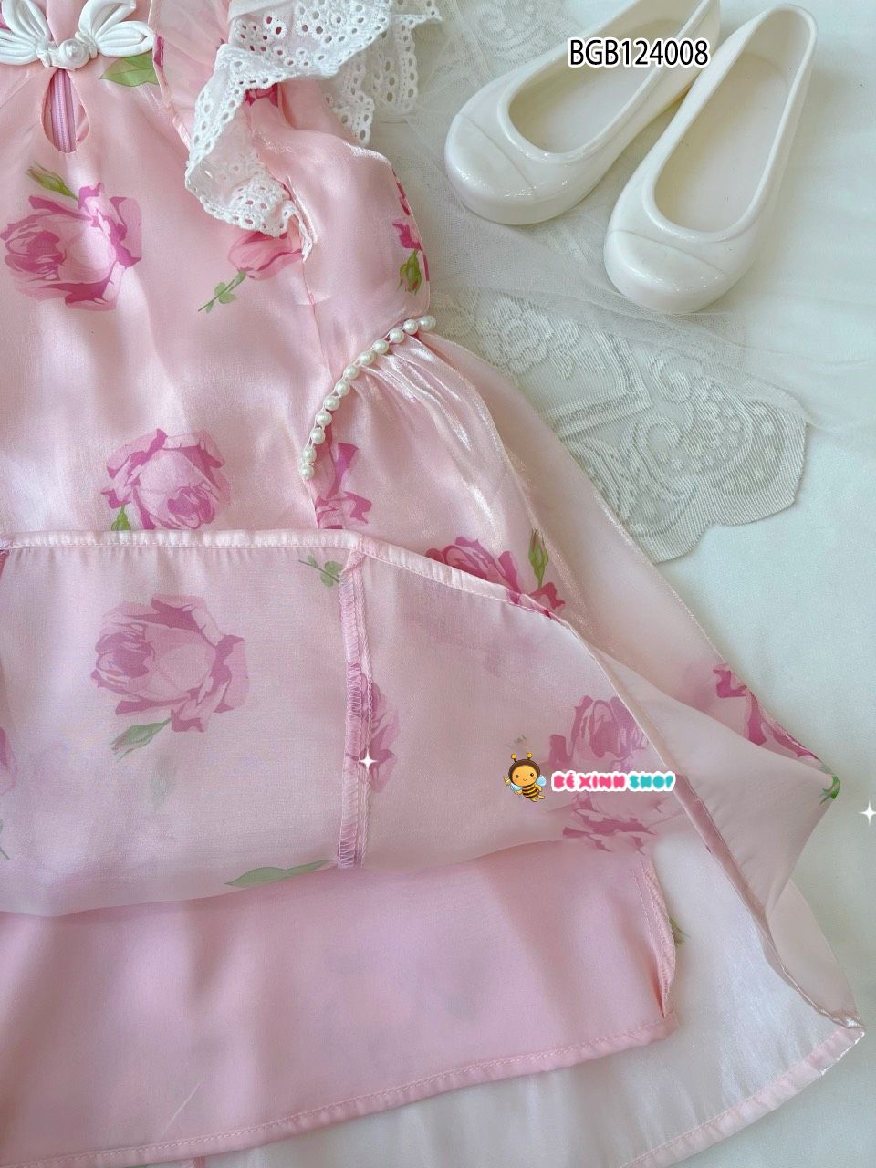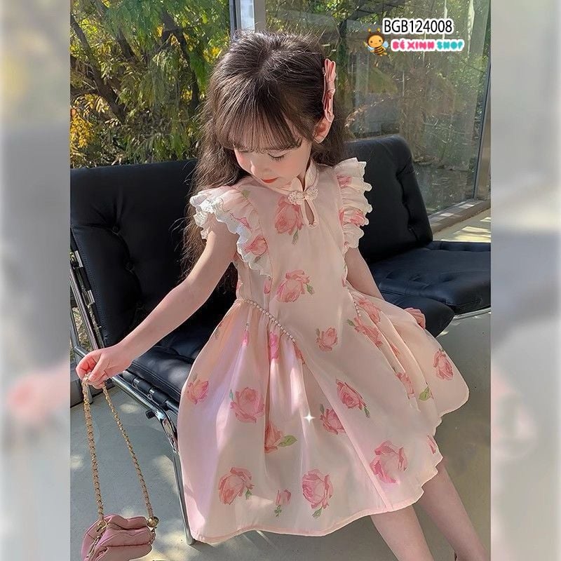 Đầm cổ tàu tay cánh tiên in bèo hồng dễ thương cho bé gái BGB124008