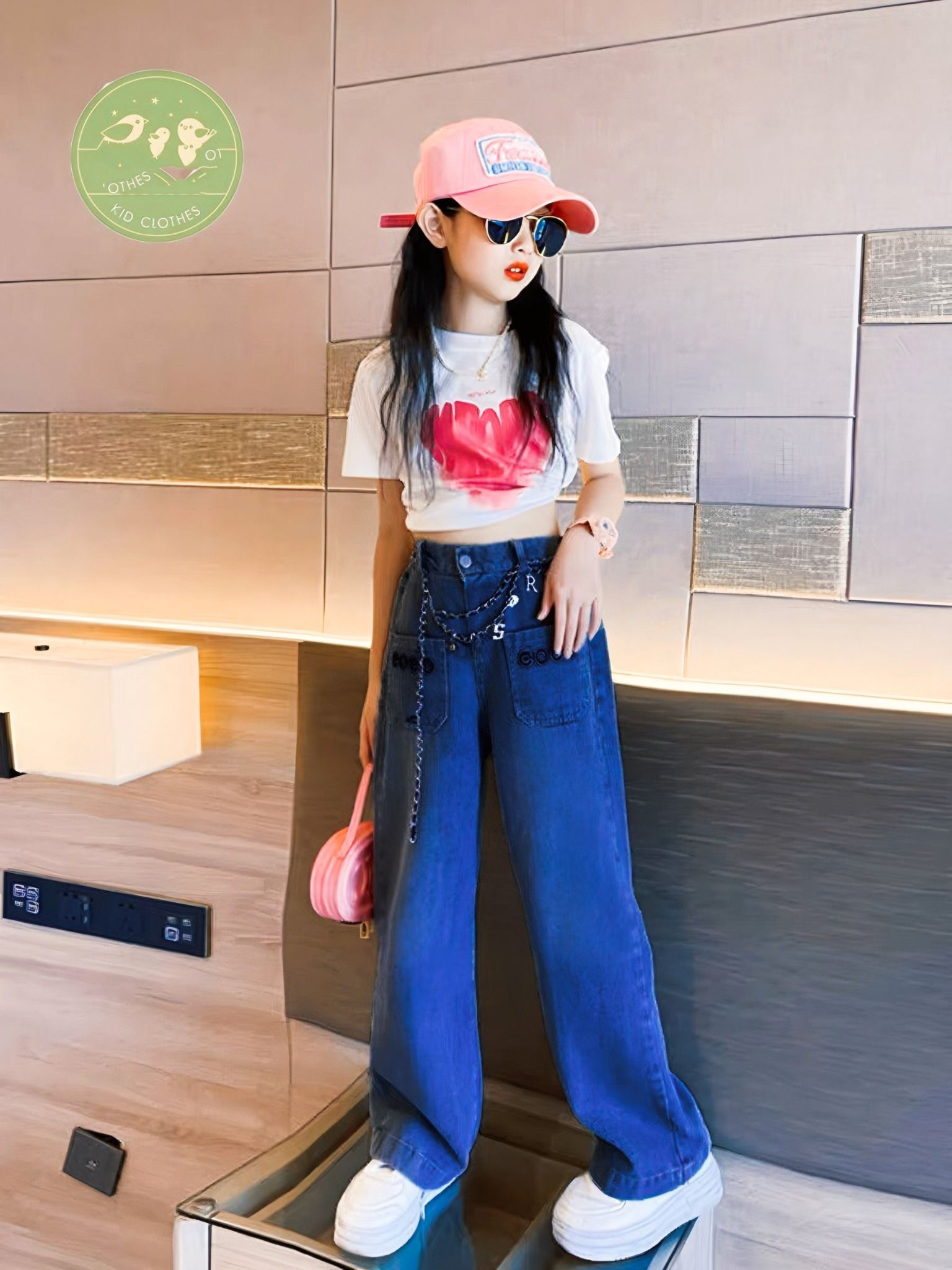 Set áo croptop tim quần jeans ống rộng dễ thương cho bé gái BGB123604