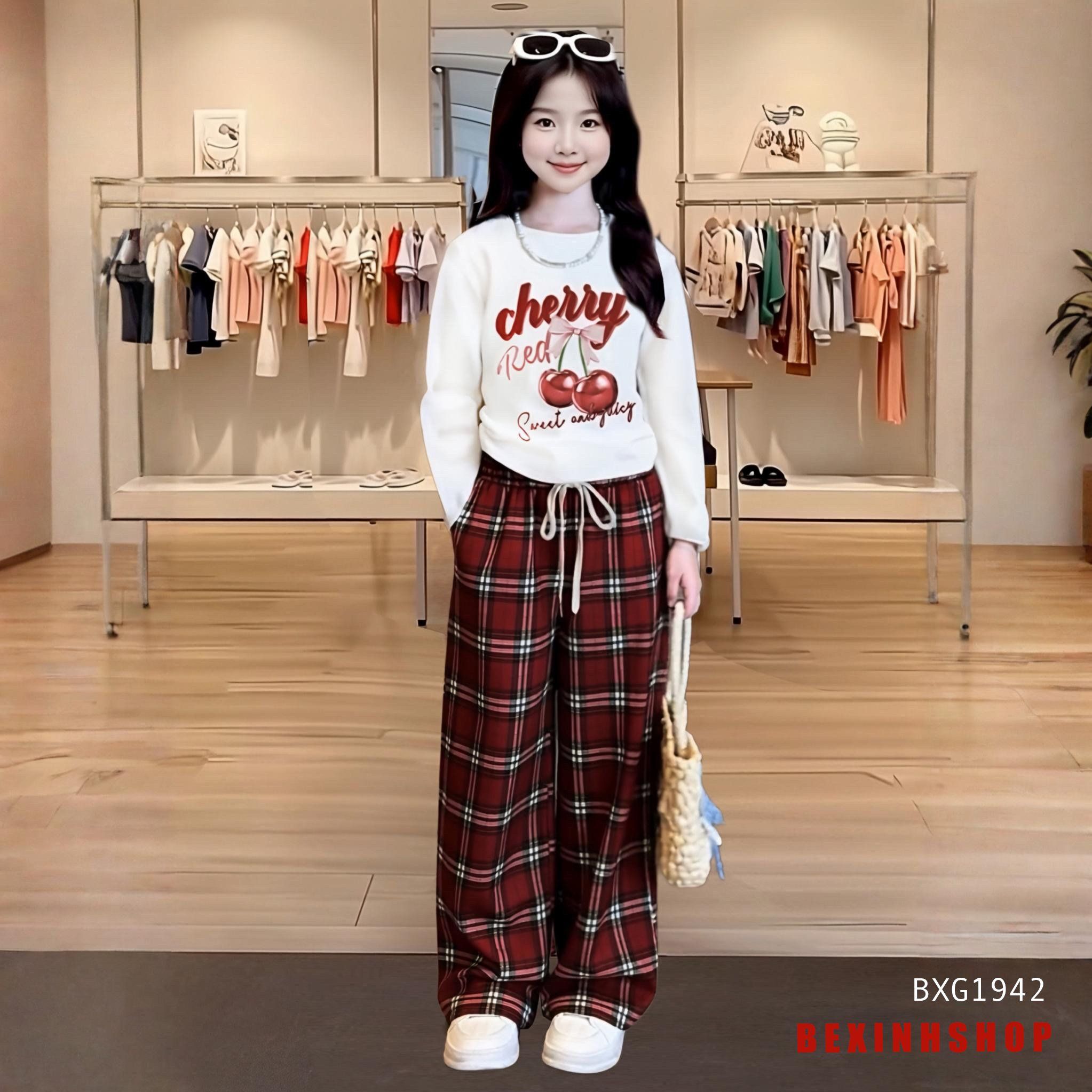 Set áo dài tay Cherry quần suông Caro dễ thương cho bé gái BXG1942
