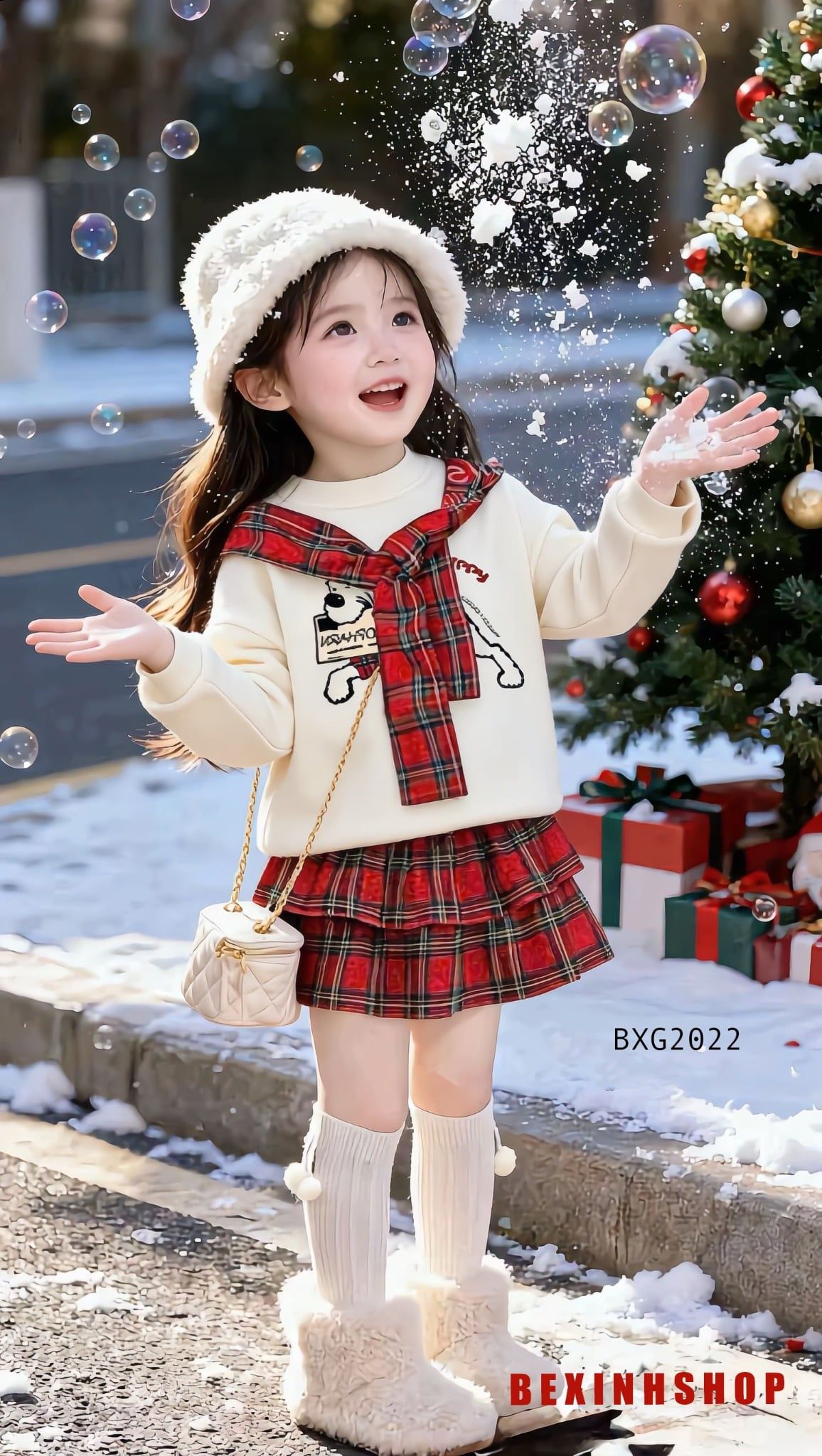 - Thiết kế đáng yêu: áo dài tay may dây cột caro cùng tone với váy, in hình cún Happy đáng yêu. Phối chân váy tầng xinh xắn, váy có may kèm chip tiện lợi.