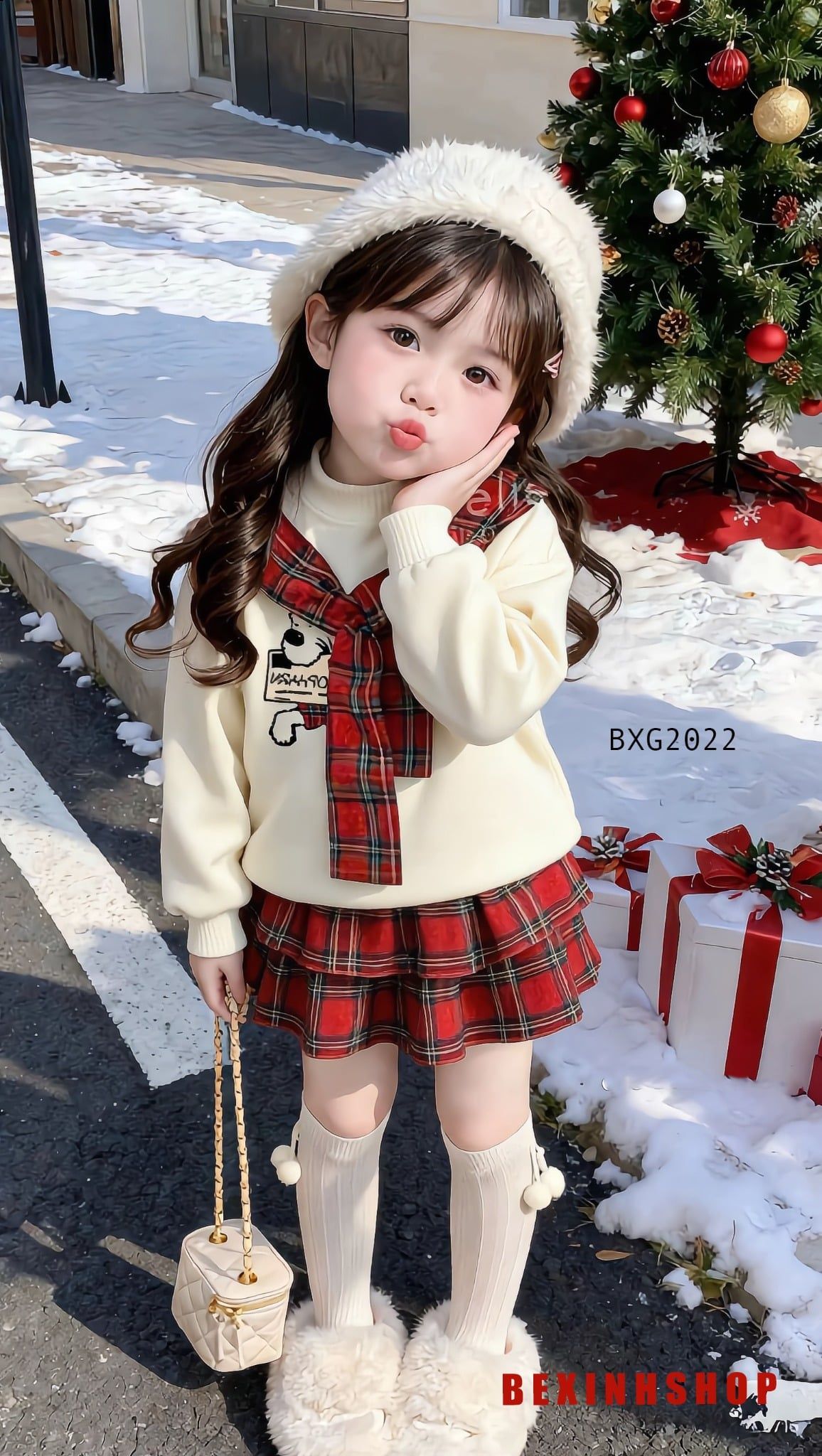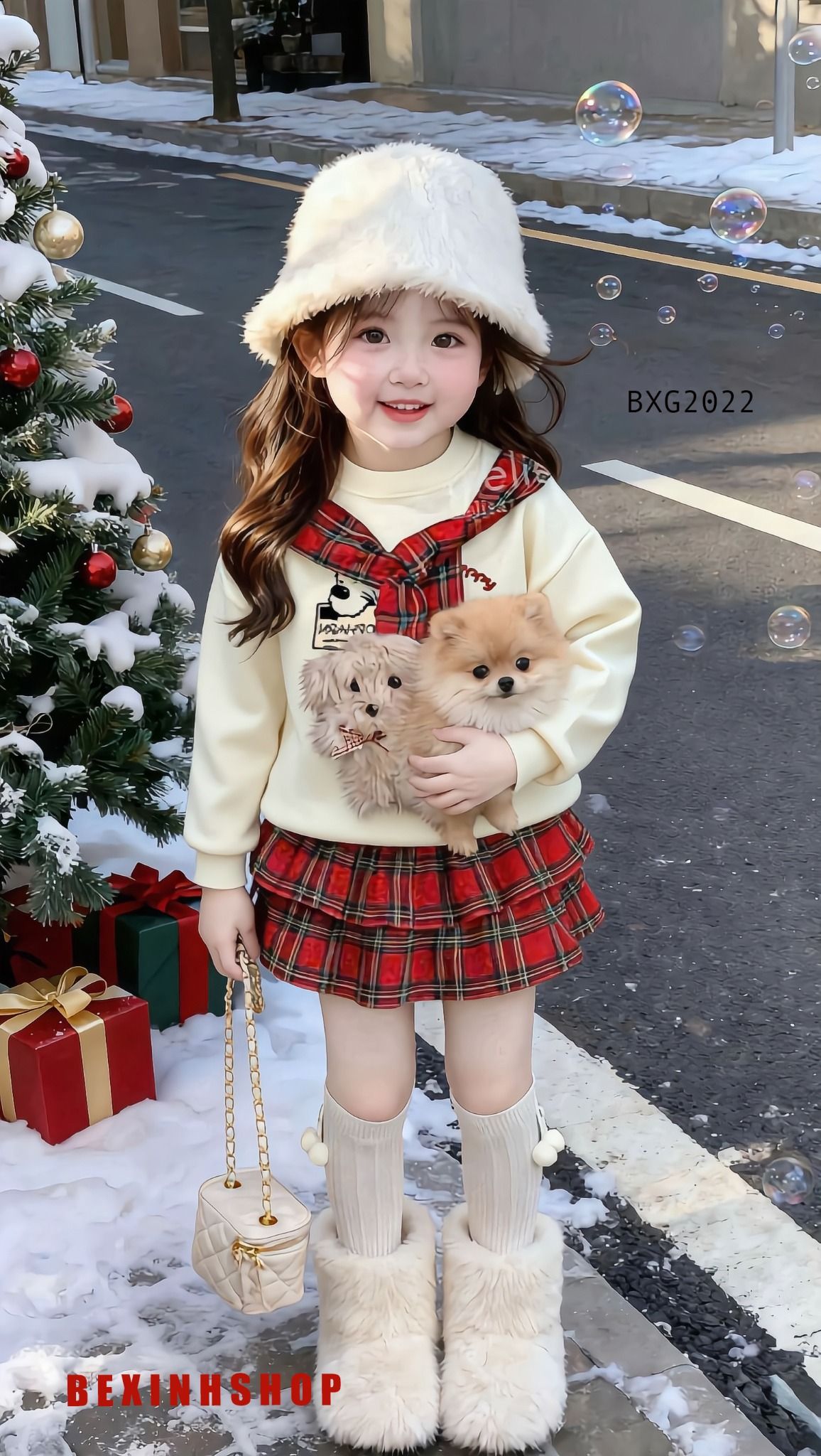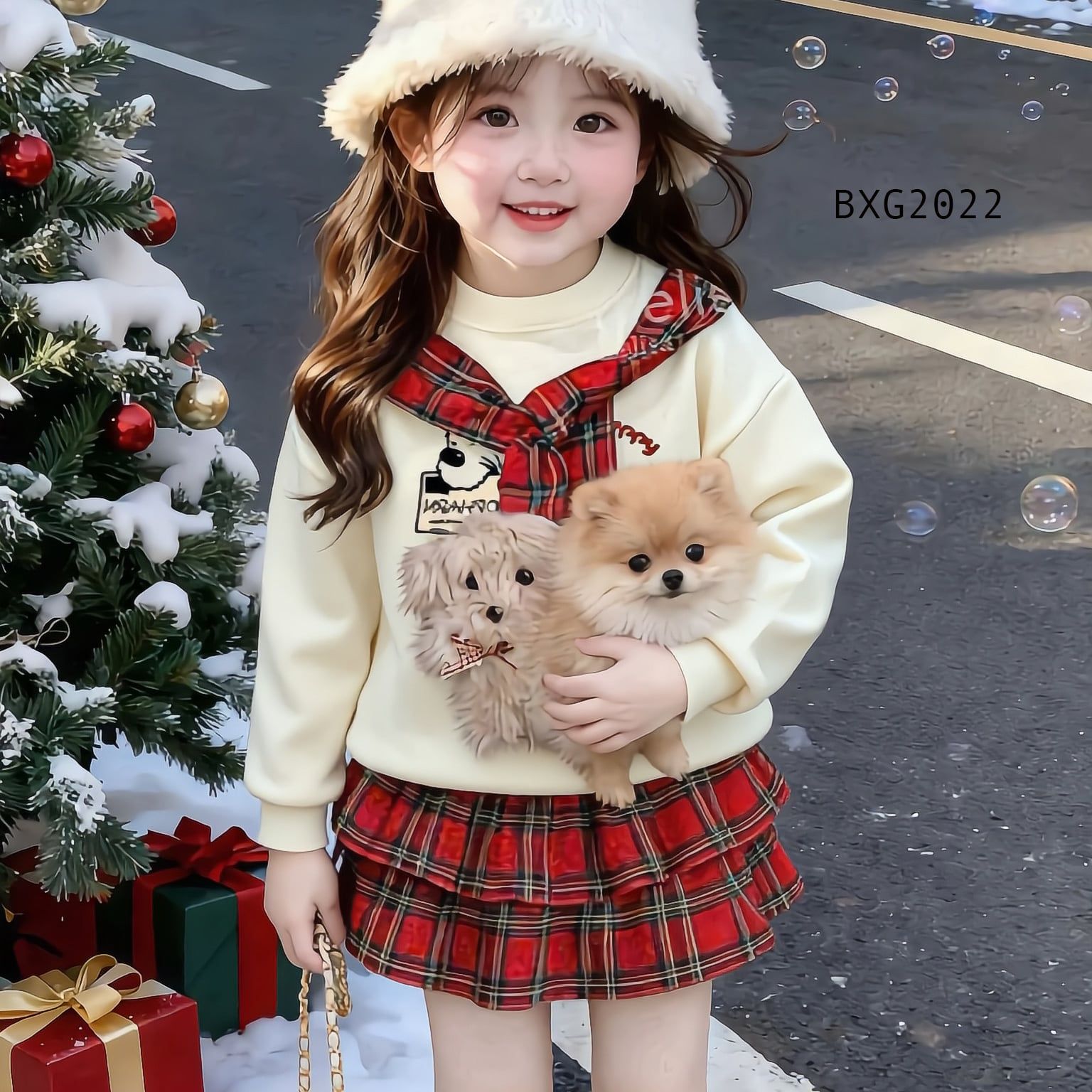 Set áo phối dây in cún chân váy tầng caro dễ thương cho bé gái BXG2022