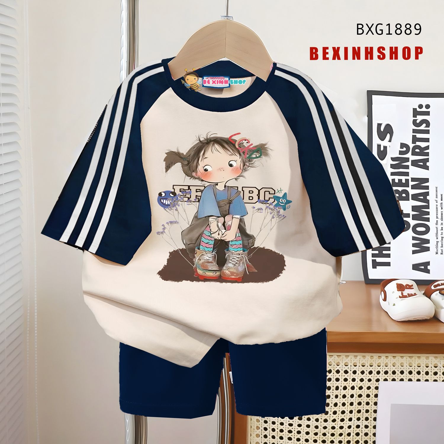 - Bộ sản phẩm được thiết kế năng động với sọc viền tay áo phối legging. Áo thun phom rộng rãi, in hình 3D đáng yêu, màu sáng tươi sáng phối quần legging lửng.