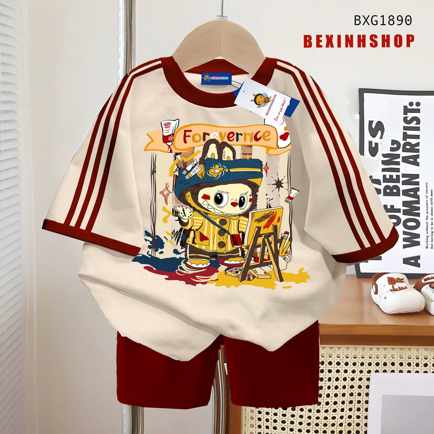 - Màu sắc: Áo Màu Kem - Quần Xanh đen & Đỏ Đô. Riêng set màu xanh Áo in 2 mặt trước sau.