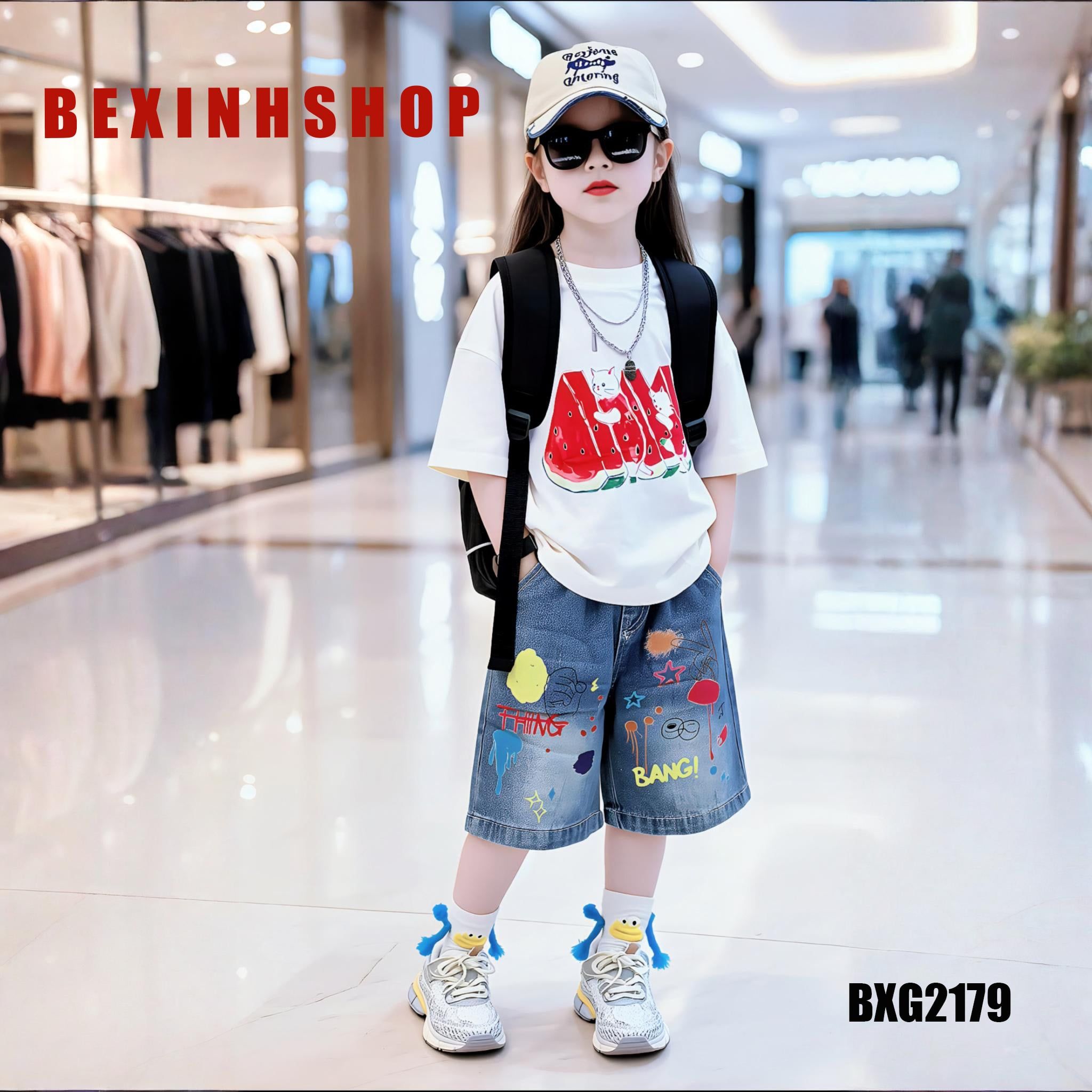 Set áo thun bé gái phối quần jeans họa tiết BXG2179